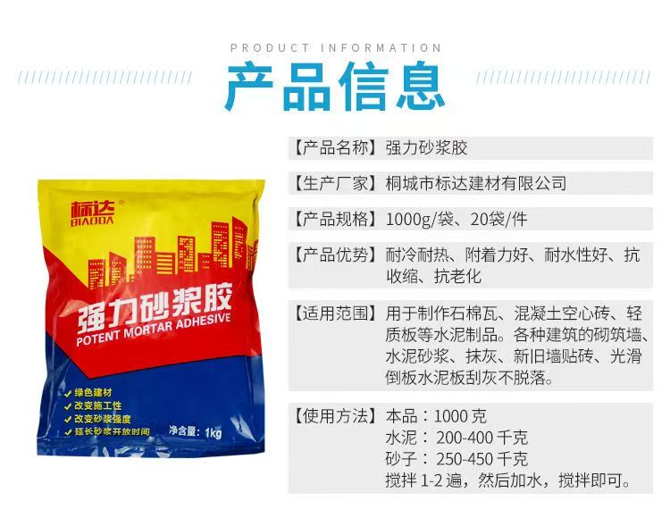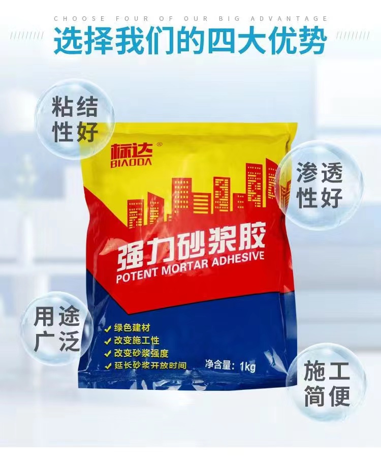 適用于各種工民建筑中的砌墻、抹灰、水泥砂漿、新舊墻貼磚、光滑水泥板批刮不脫落,方便施工。